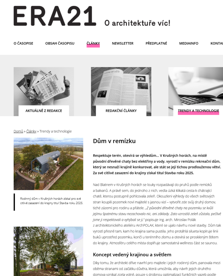 Stavba roku 2025 Návrh stavby: Ing. arch. Miroslav Polák, ateliér ArchPOLAK, www.archpolak.cz Interiér: Ing. arch. Jana Kašparová, ateliér Čtyři stěny, www.ctyristeny.cz Foto: pro M&T Tomáš Dittrich Lokalita: Blatno, Krušné hory Realizace: 2024 Užitná plocha: 367 m2 Systém výstavby: Zděná stavba (keramické zdivo), částečně betonová monolitická, strop monolitický a dřevěný trámový, krov dřevěný Zdroj vytápění: Tepelné čerpadlo vzduch-voda, doplňkový zdroj teplovzdušný krb Materiály a dodavatelé: