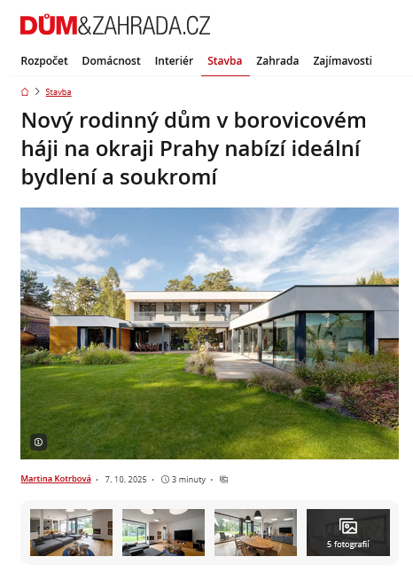 • Stavební hmoty na hrubou stavbu – Porotherm, železobeton, fasáda: přírodní kámen a dřevo na roštech – provětrávaná fasáda